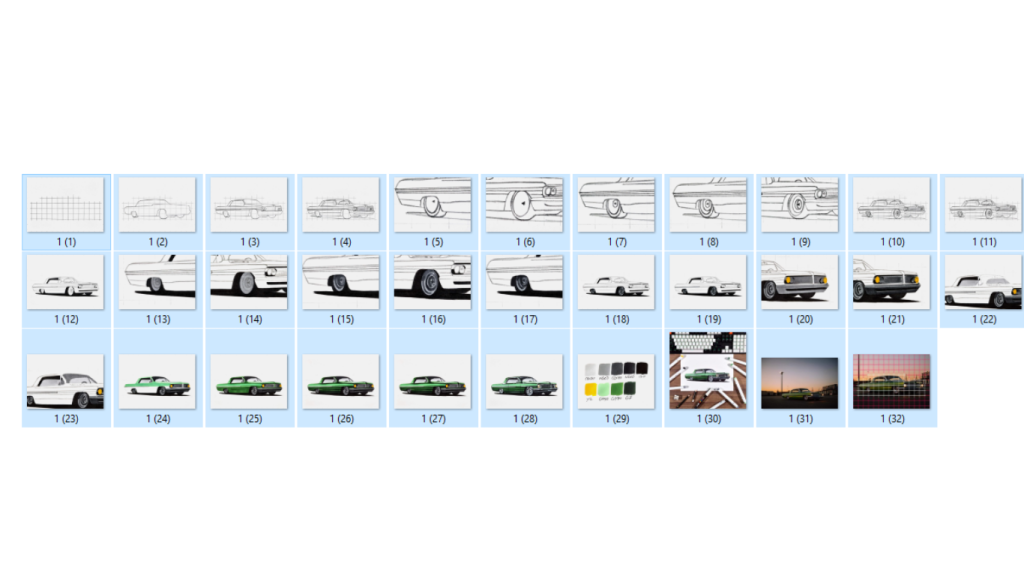 Since it serves as the foundation for the drawing, I prefer to begin with the car’s outline. This must contain all of the other sketches we will do.