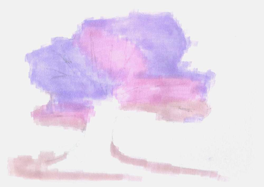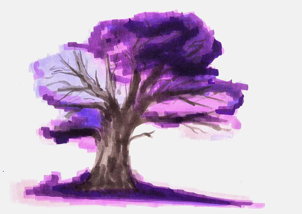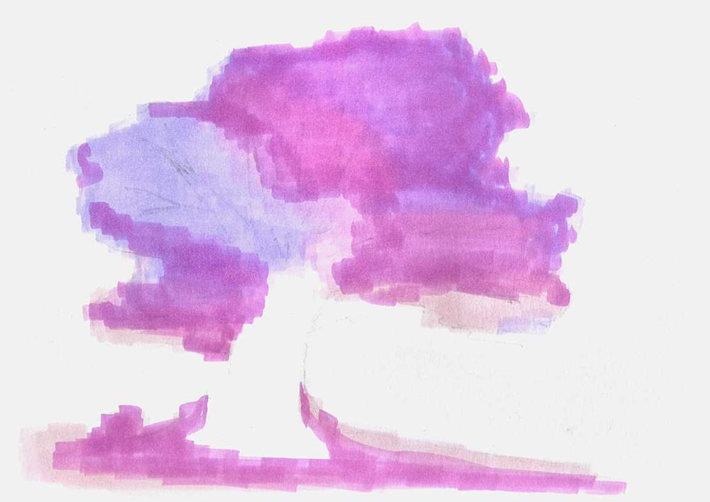 I then applied extra shading to the tree’s upper right and a small amount to its lower left and right using Lavender (P4). To add some texture to the tree, I made these markings more scribble-like.